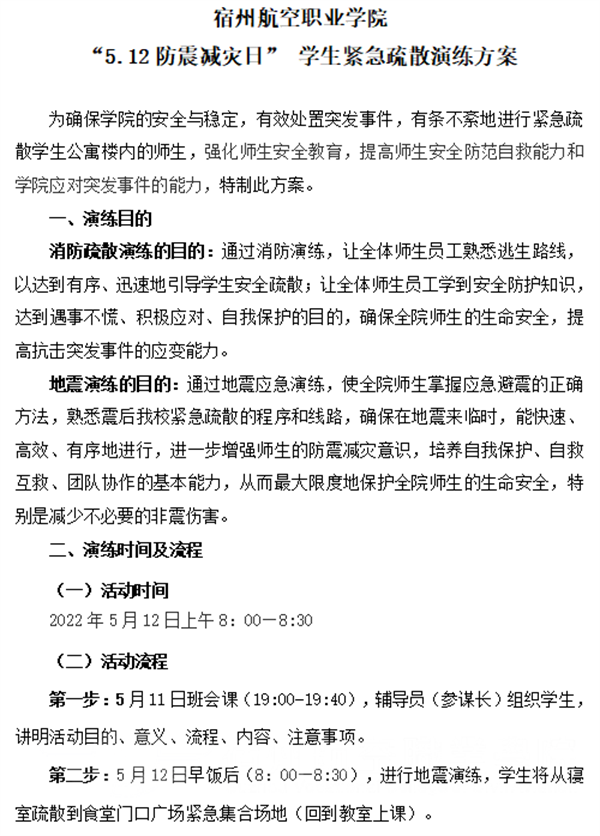 2022年5月12日是我国第14个全国防灾减灾日,今年的主题是“减轻灾害风险🦹🏽‍♂️,守护美好家园”。为进一步做好防灾减灾工作🐮,加强全体师生在突发灾害时的应急反应能力和自救互救能力,提高安全意识和逃生自救能力🈲。5月12日🏊🏽‍♂️,宿航精心组织🚷,顺利开展了一场防震减灾应急疏散实战演练。