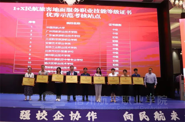 在航协翔宇2022-2023年度“1+X”证书试点项目优秀示范考核站点表彰环节,宿航凭借着在“1+X”考试中系统的组织与周密的安排,获得了民航旅客地面服务职业技能等级证书优秀示范考核站点称号。