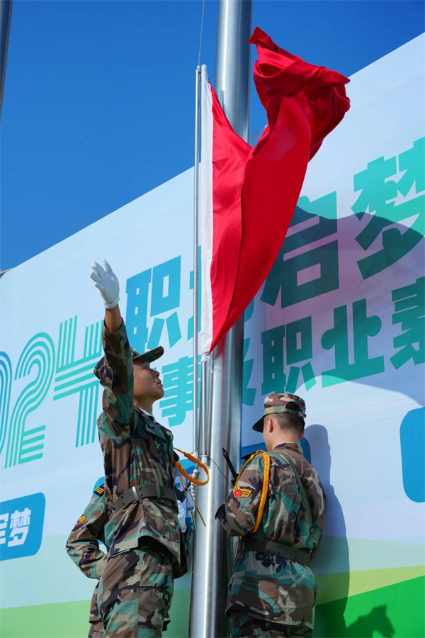 国旗护卫队迈着铿锵有力的步伐🔐,护送国旗来到升旗台前。伴随着激昂雄壮的国歌,五星红旗冉冉升起👏🏿,大会正式拉开序幕🫸。