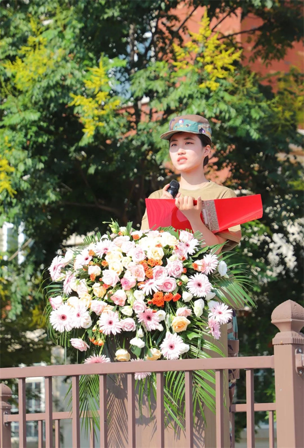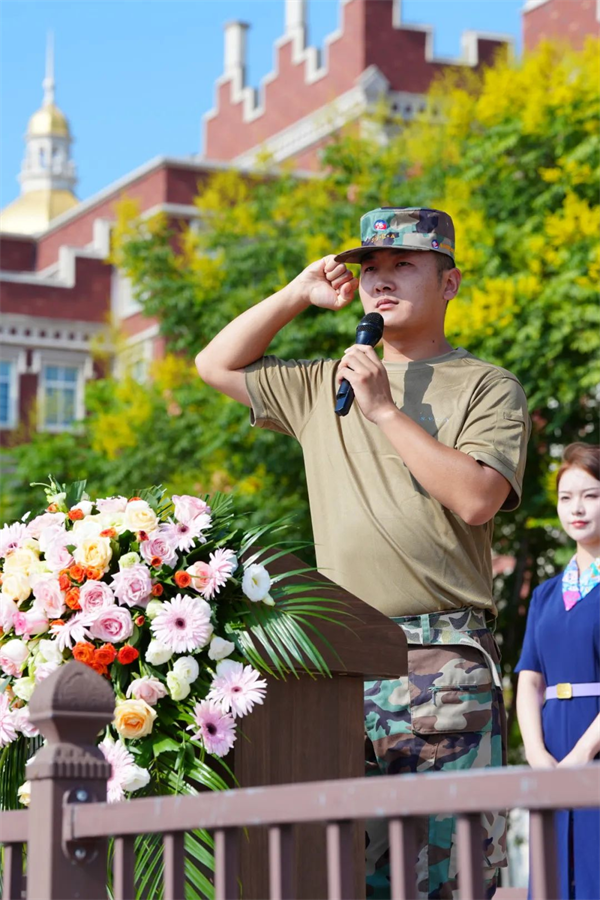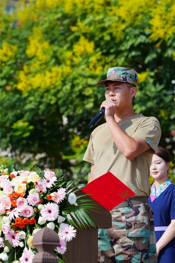 24级空乘2班新生王柄骅代表全体新生郑重宣誓:一、以军人的标准严格要求自己。二、不怕吃苦🤱🏼👩🏿‍🍼,团结一心🍢。三👨‍🦳、尊重教官,虚心学习🙆🏻‍♂️。表示会以优异的成绩完成训练任务。