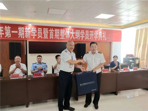 典礼伊始,泛美通航集团代总裁杨建敏为春秋航空公司领导赠送礼品;云非实业集团人力资源部副总裁陆丹女士为学员代表发放学员手册和飞行员徽章。