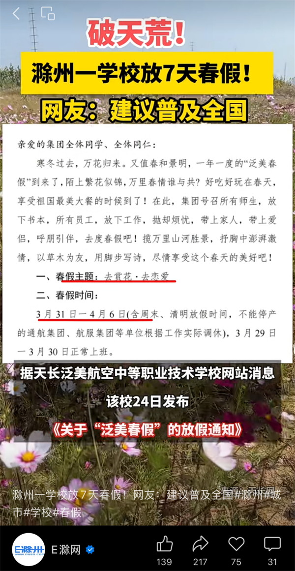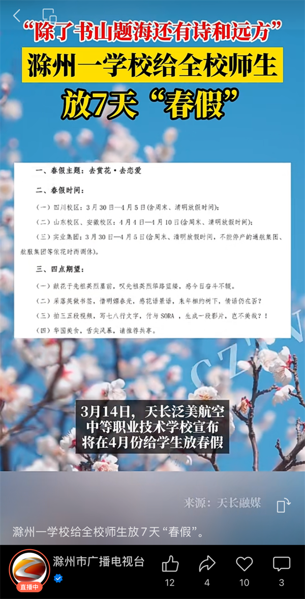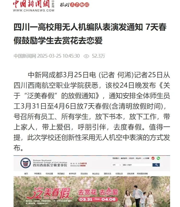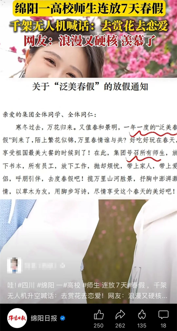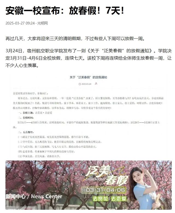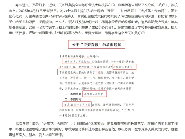 “学校放春假,让大家去游玩,去恋爱”的消息获央视新闻周刊的关注,央视主持人白岩松硬核喊话🦸🏼♂️,“春光正好,众多学校是不是也抄抄这份作业”🤷🏽♂️🤑,呼吁其他学校“抄作业”。