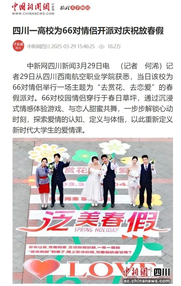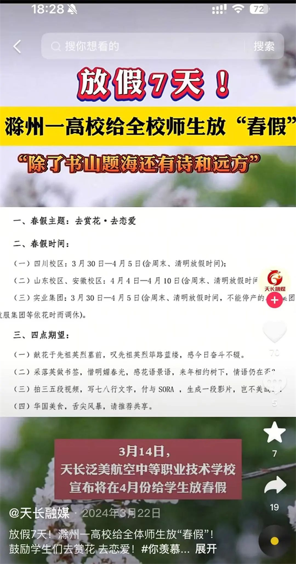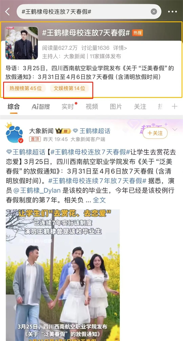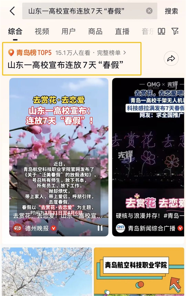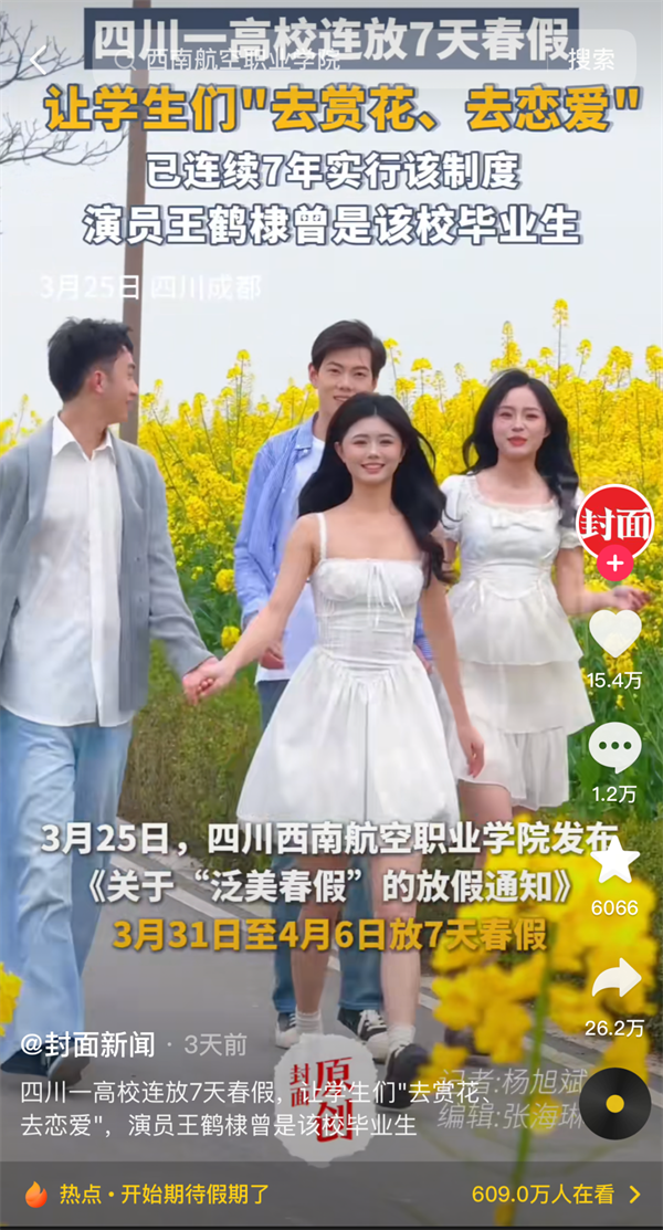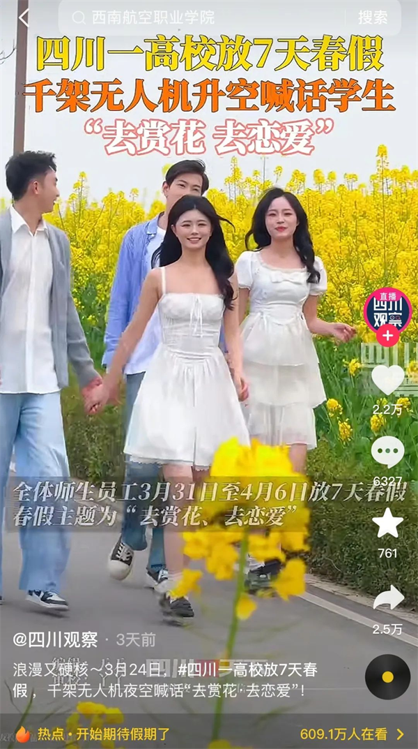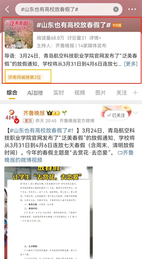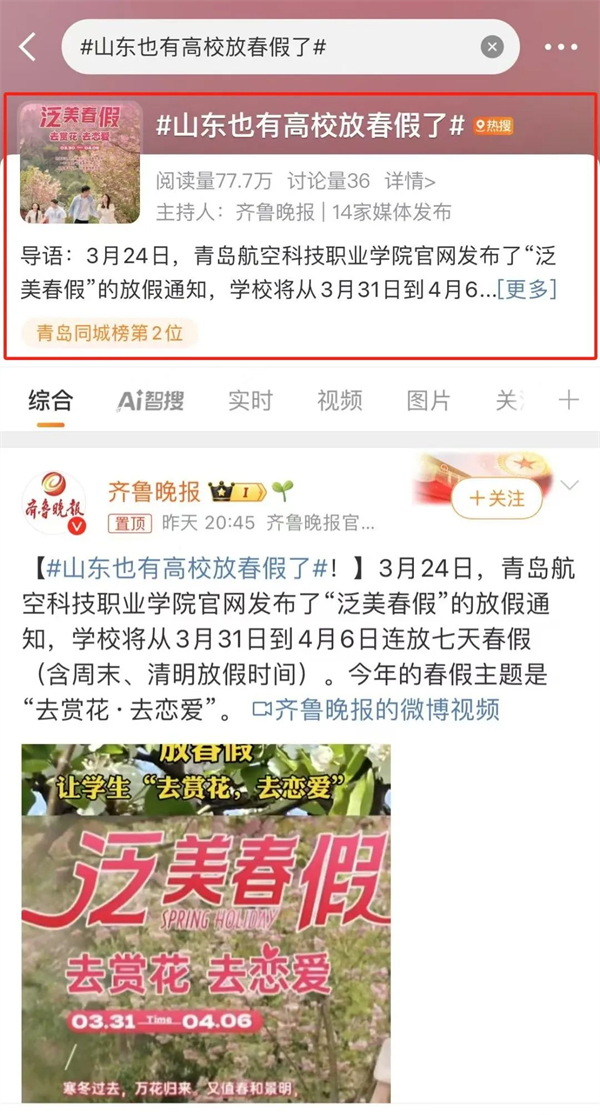 “泛美春假”“高校放7天春假鼓励赏花恋爱”的话题,持续发酵,在多个新闻客户端的头条推送、还登上了各地区抖音👨🏼🦳、微博、微信搜索等实时热度榜单……