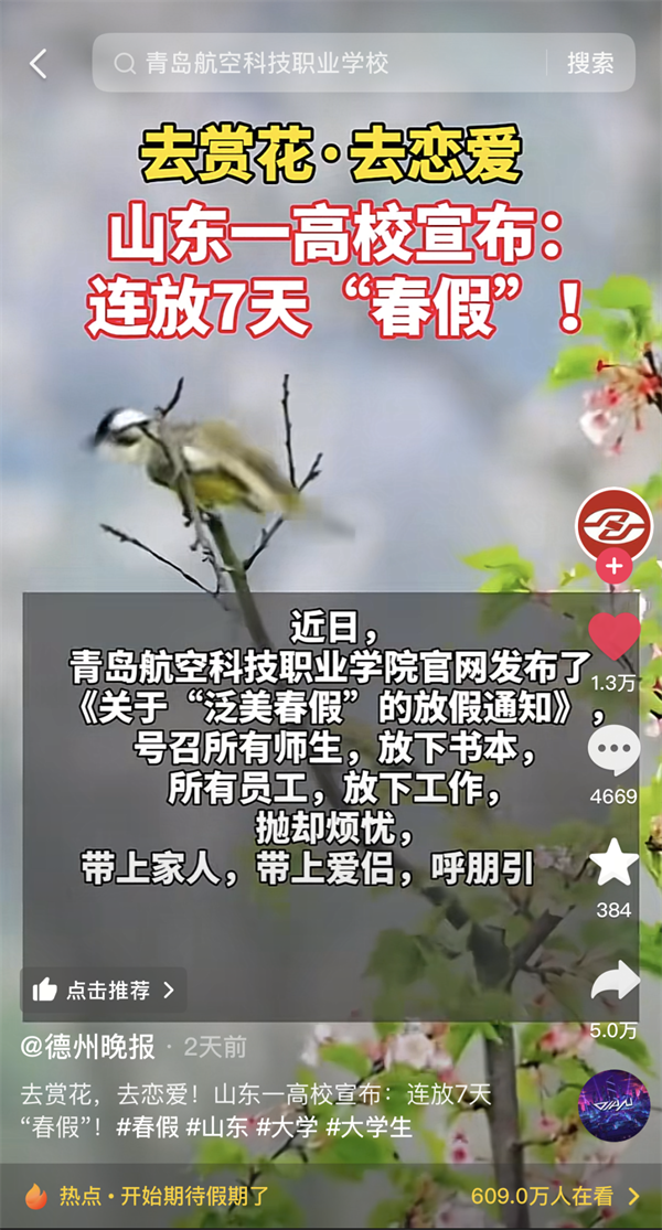 共青团山东省委官方公众账号青春山东头条转发“羡慕了!山东一高校宣布连放7天‘春假’”。