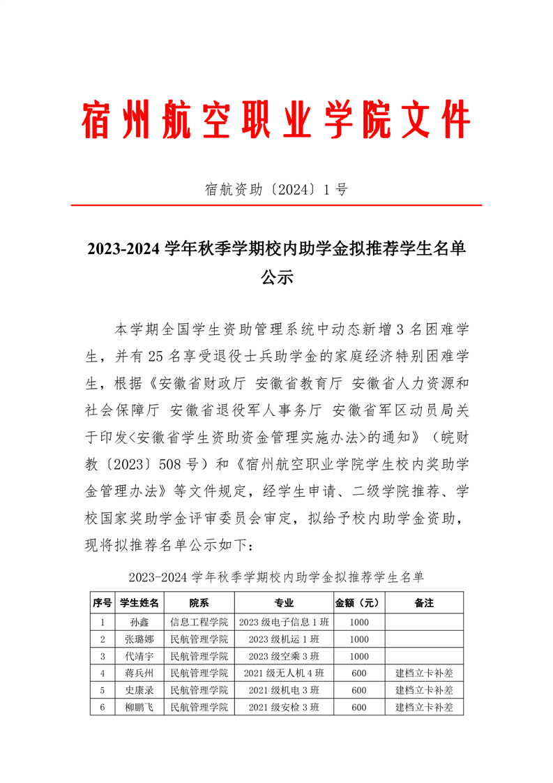 关于2023-2024学年秋季学期校内助学金拟推荐学生名单公示