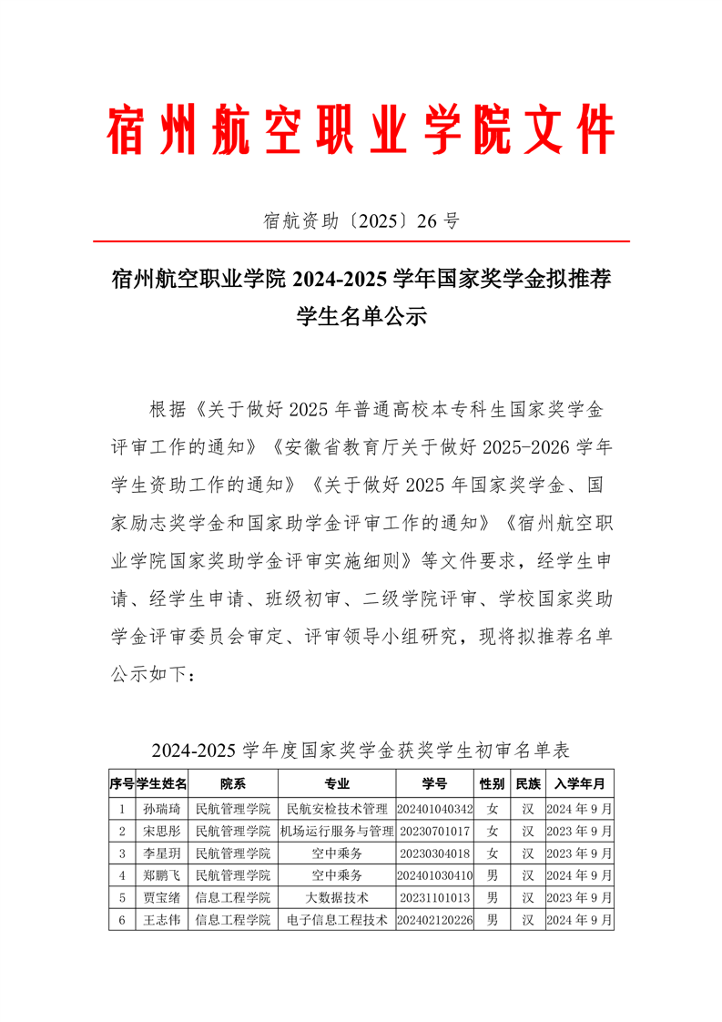 彩神Vll学院2024-2025学年国家奖学金拟推荐学生名单公示