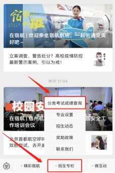 2.进入公众号后点击下方“招生专栏”,之后点击上方“分类考试成绩查询”🧘,进入查询页面;