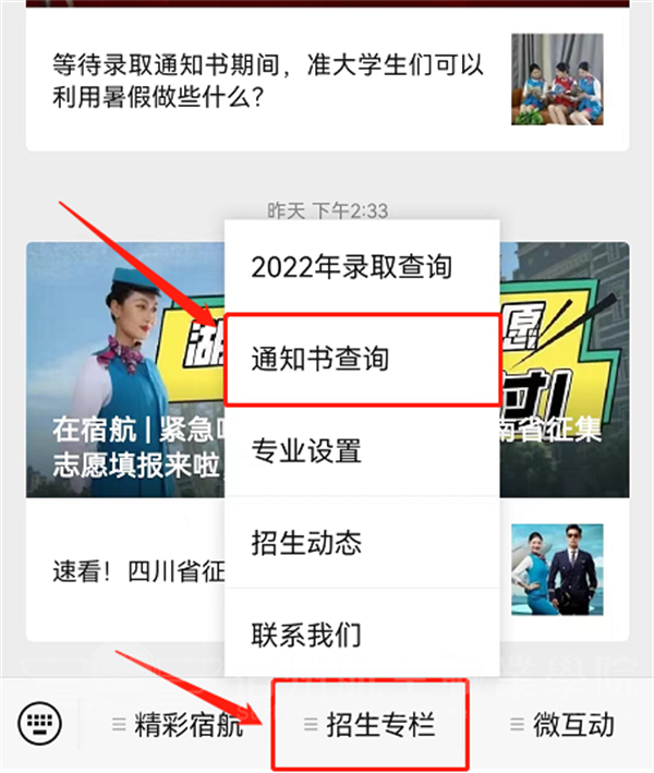 2.进入公众号后点击“招生专栏”💆🏼♀️,点击上方“通知书查询”🧑🏽✈️;