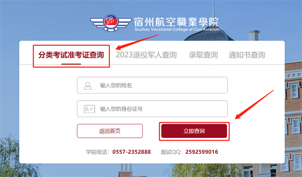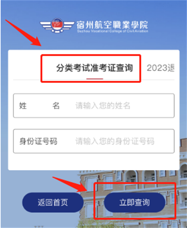 2.进入后点击“分类考试准考证查询”,根据提示填写学生姓名及身份证号码,填写正确后🏉,点击下方“立即查询”🏇🏼,即可查看准考证🧑🏼‍💻;