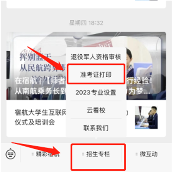 2.进入公众号后点击下方“招生专栏”,之后点击上方“准考证打印”👩🏻‍💻,进入准考证查询页面;