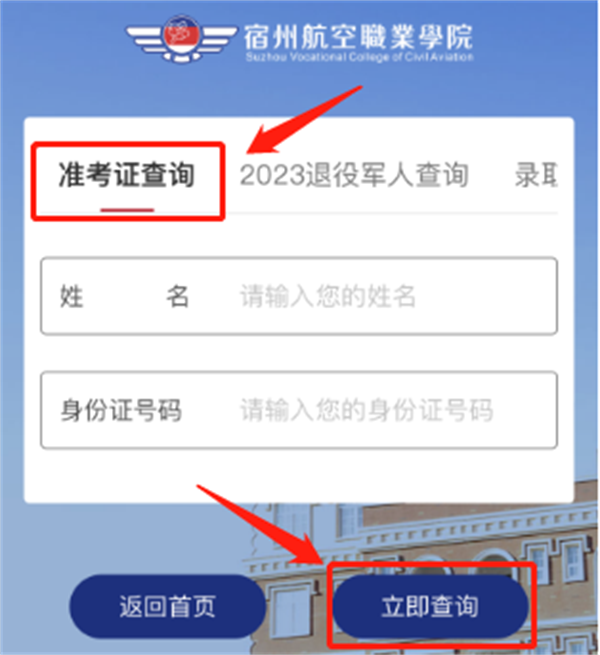 3.进入后点击“准考证查询”,根据提示填写“姓名”及“身份证号码”⬆️,核实无误后,点击下方“立即查询”👩‍🦯‍➡️🤵🏻,即可查看准考证🫰🏼;