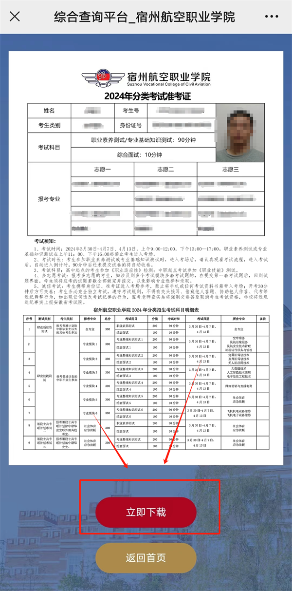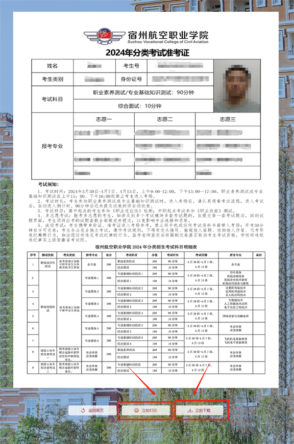 3.点击立即查询后,即可查看准考证信息👳🏽,请考生仔细核对个人信息,核对无误后,点击下方立即打印立即下载,打印准考证。