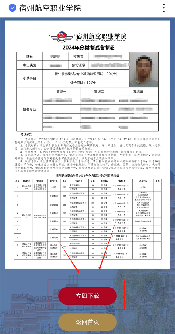 4.点击立即查询后,即可查看准考证信息,请考生仔细核对个人信息,核对无误后,点击下方立即下载,下载准考证。