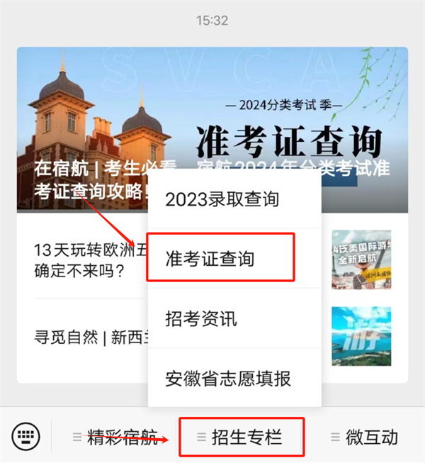 2.进入公众号后点击下方招生专栏💼,之后点击上方准考证查询,进入查询页面;