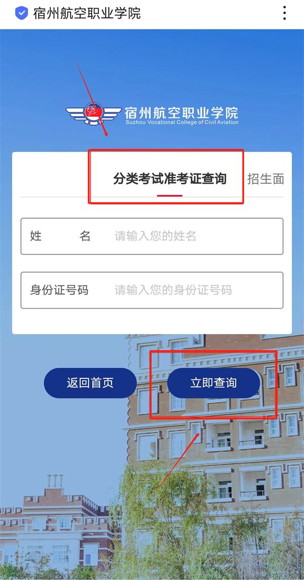 2.进入后点击分类考试准考证查询🫰🏻,根据提示填写学生姓名及身份证号码,填写正确后,点击下方立即查询