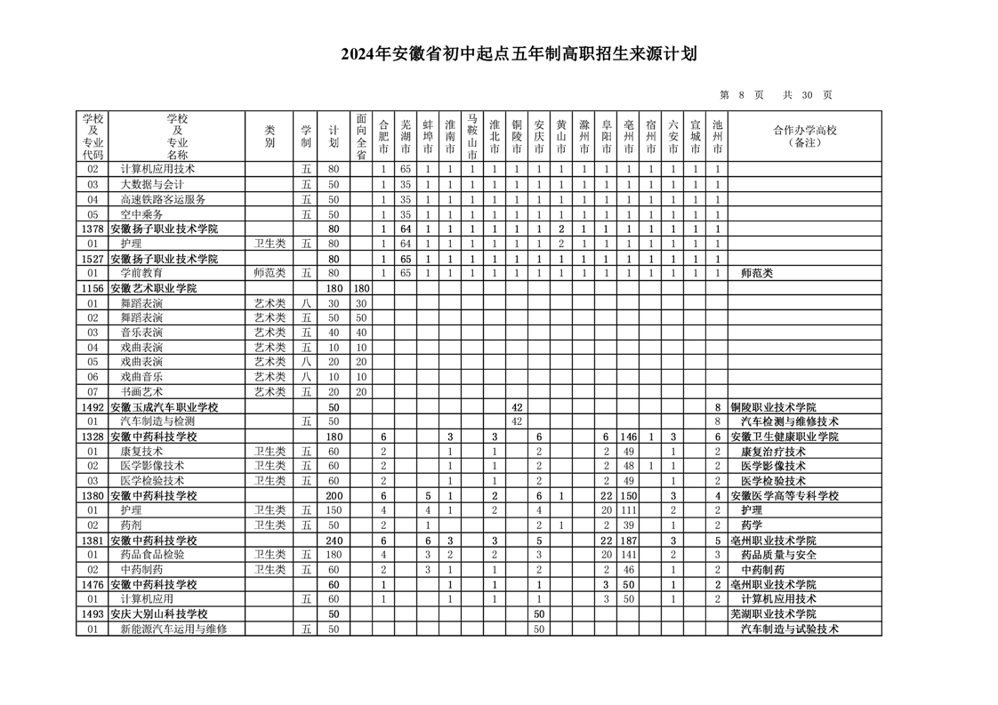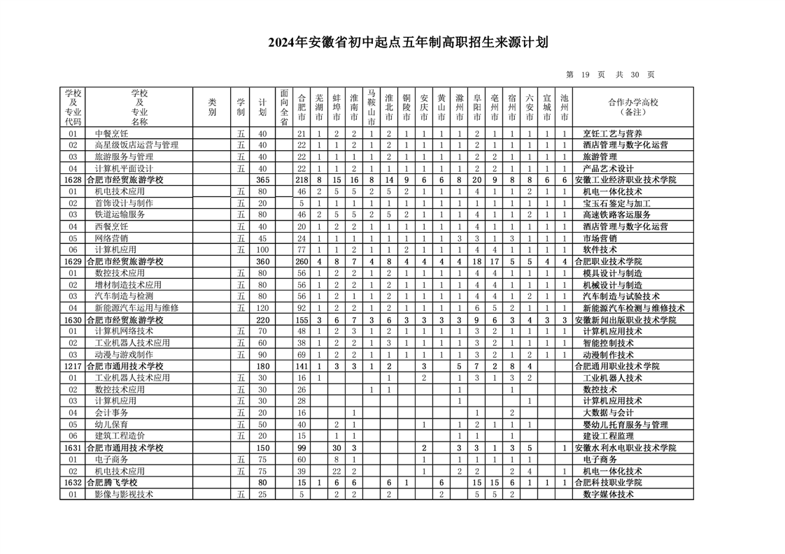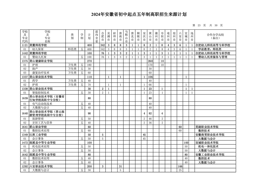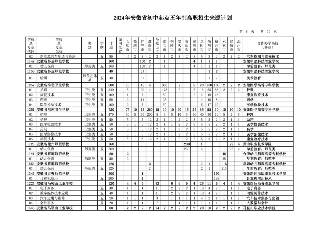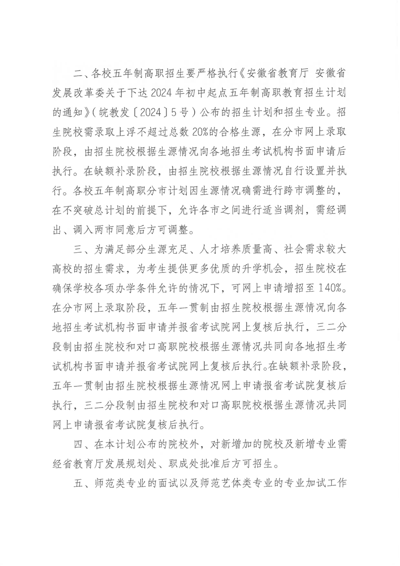 安徽省教育招生考试院关于印发2024年安徽省初中起点五年制高职招生来源计划的通知