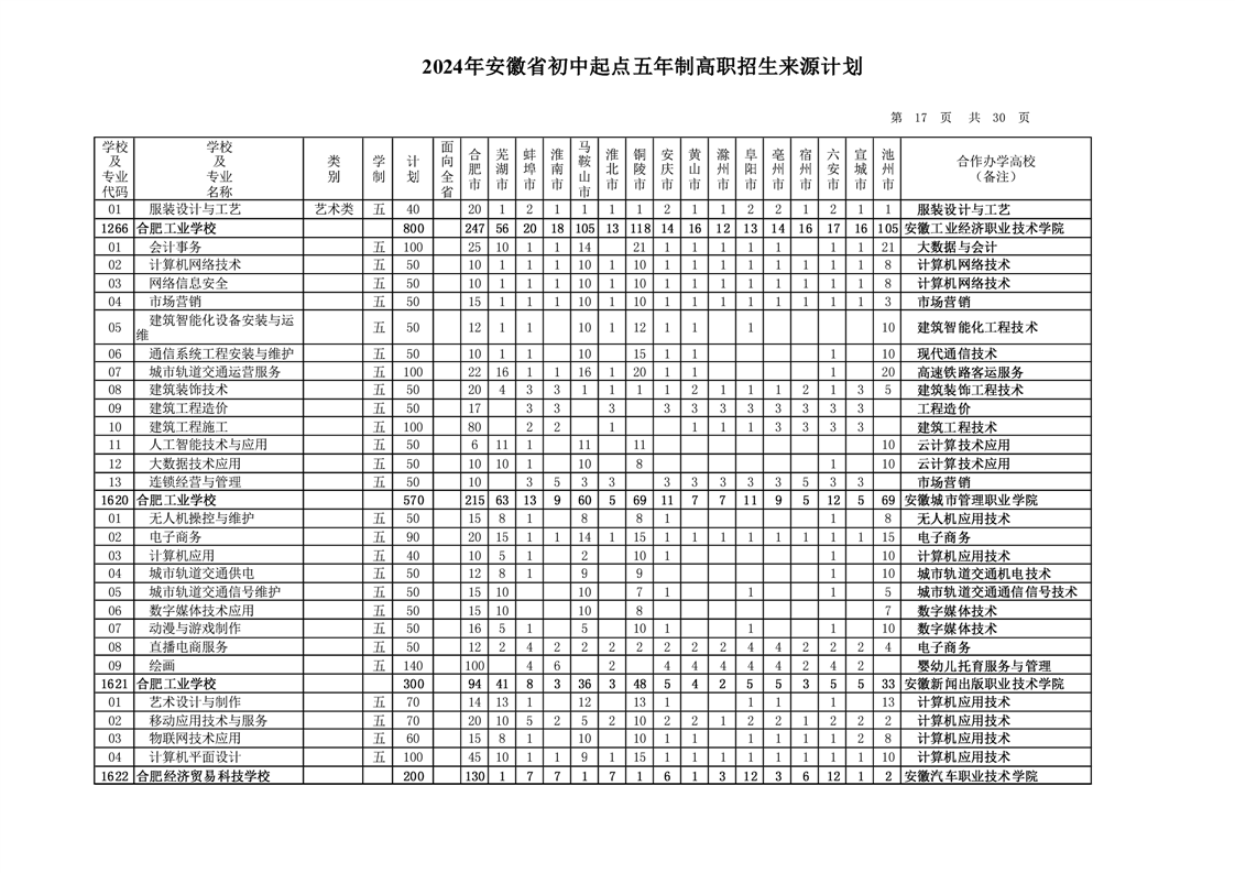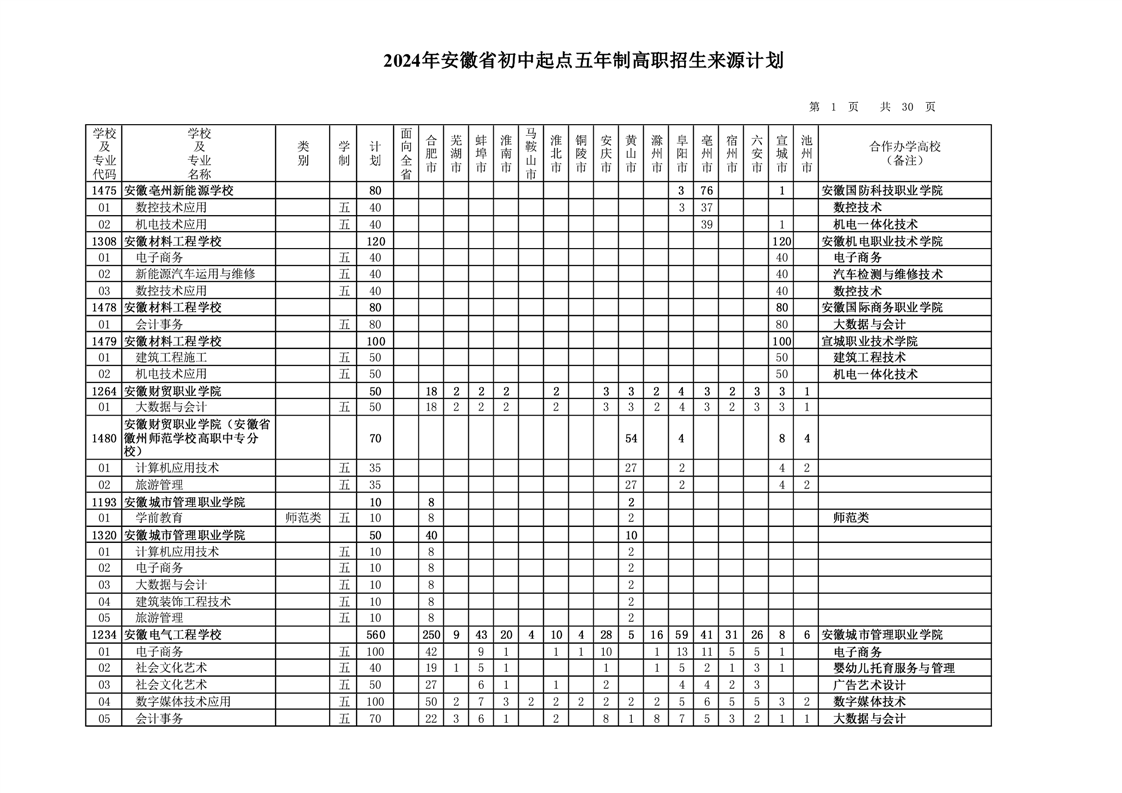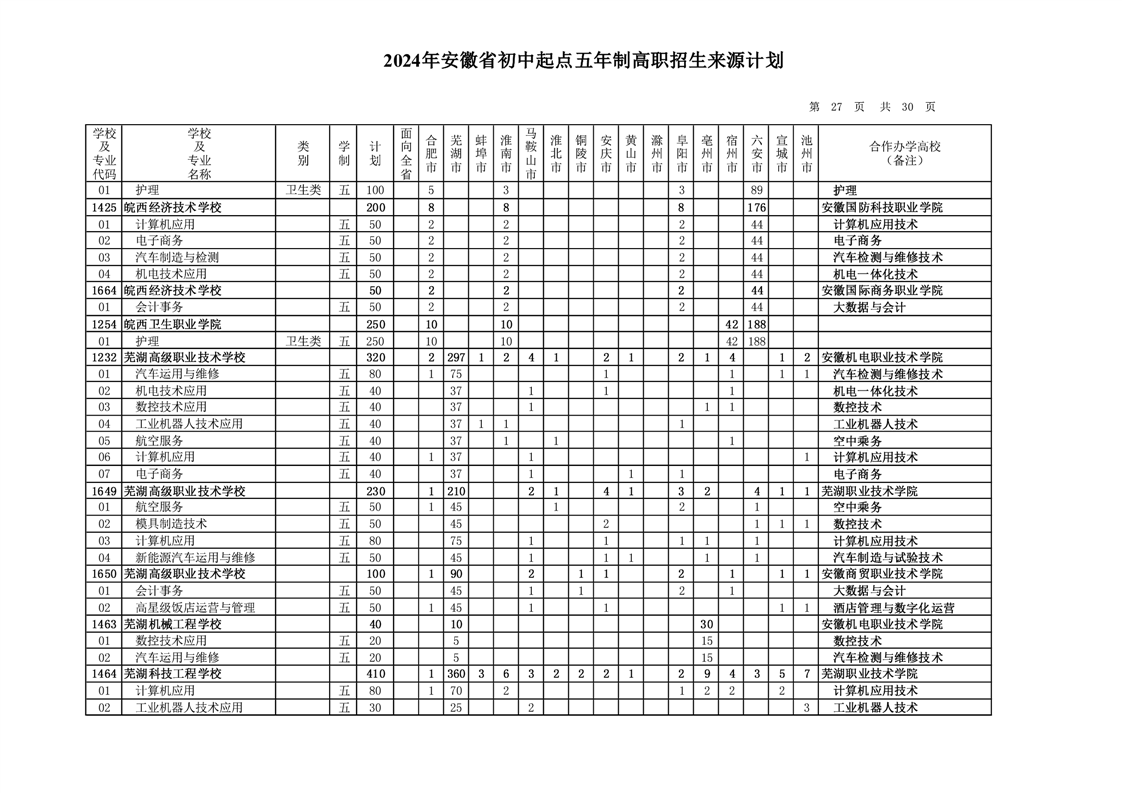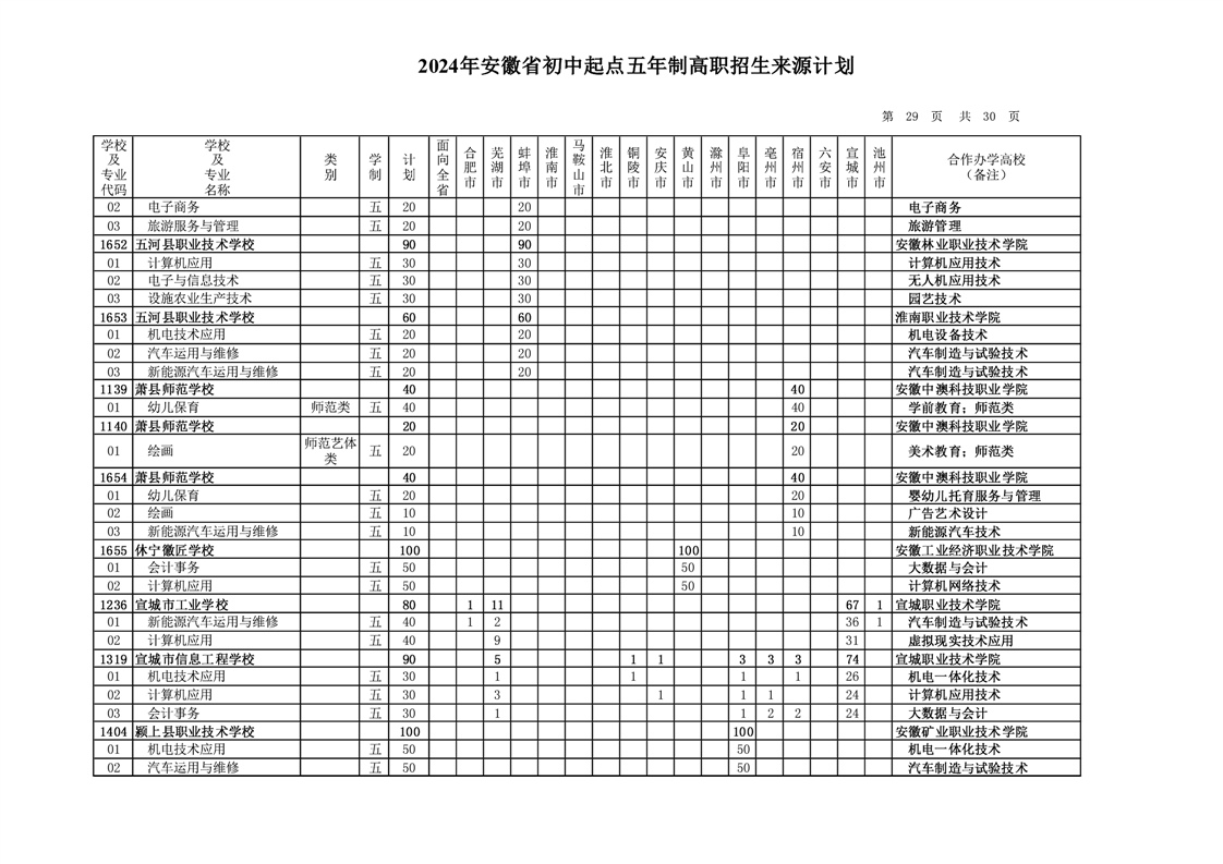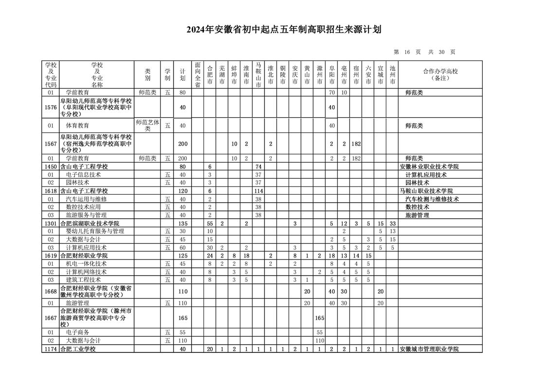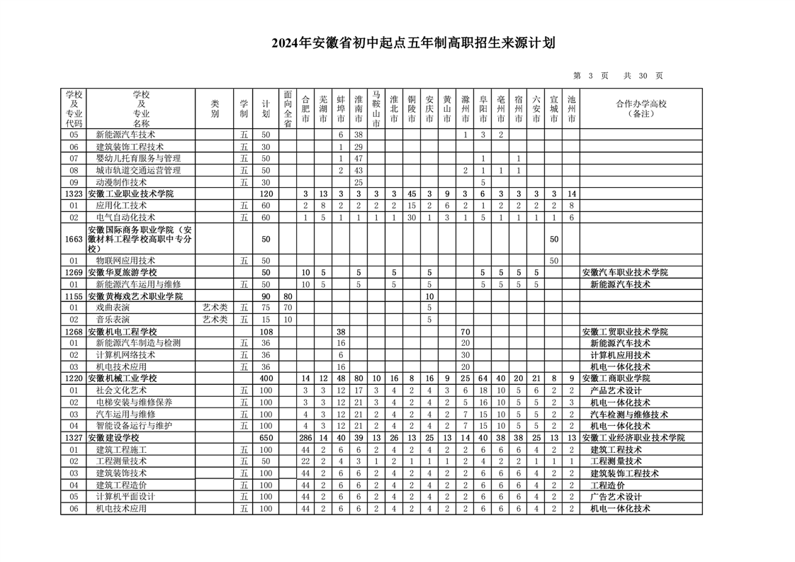 安徽省教育招生考试院关于印发2024年安徽省初中起点五年制高职招生来源计划的通知