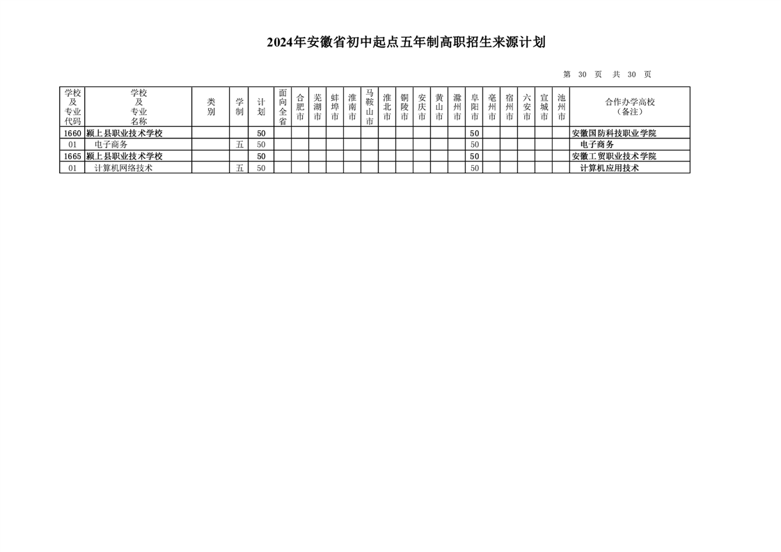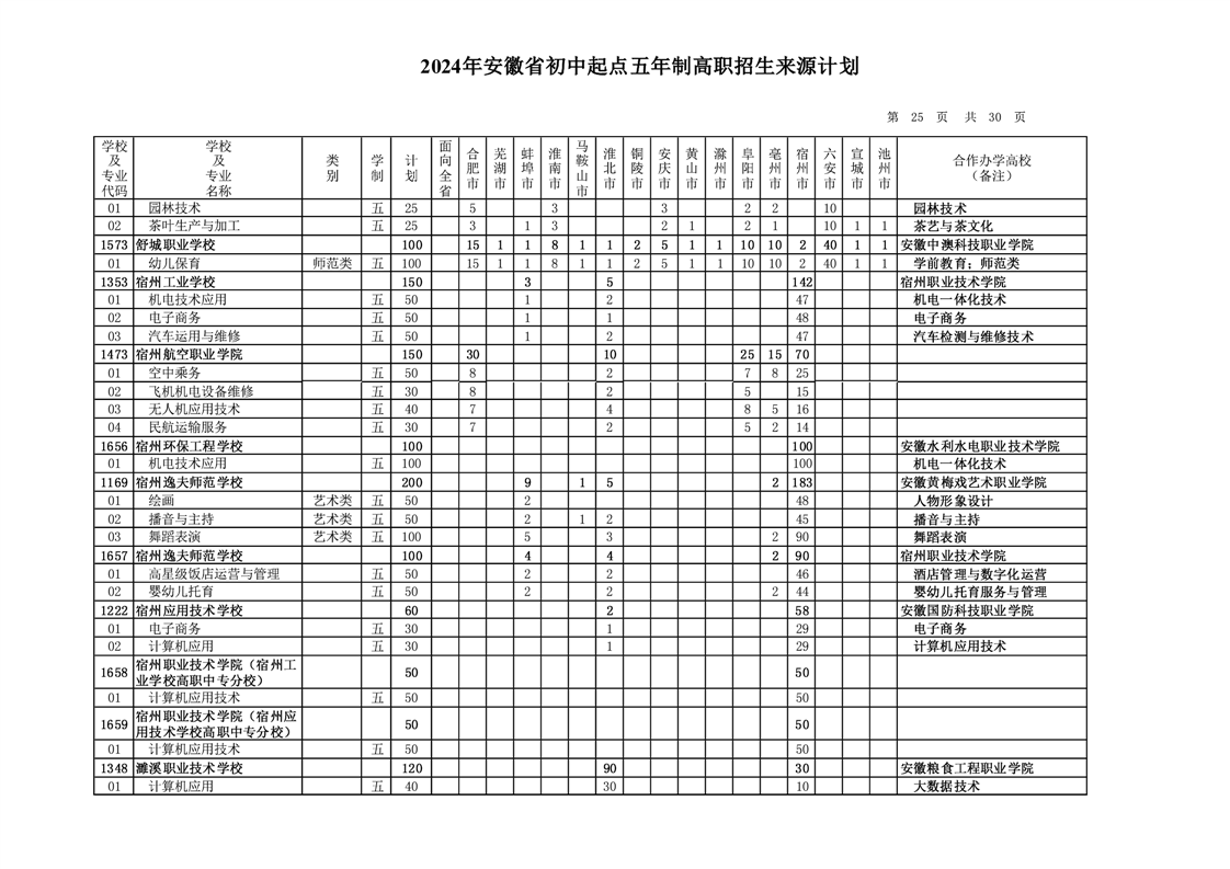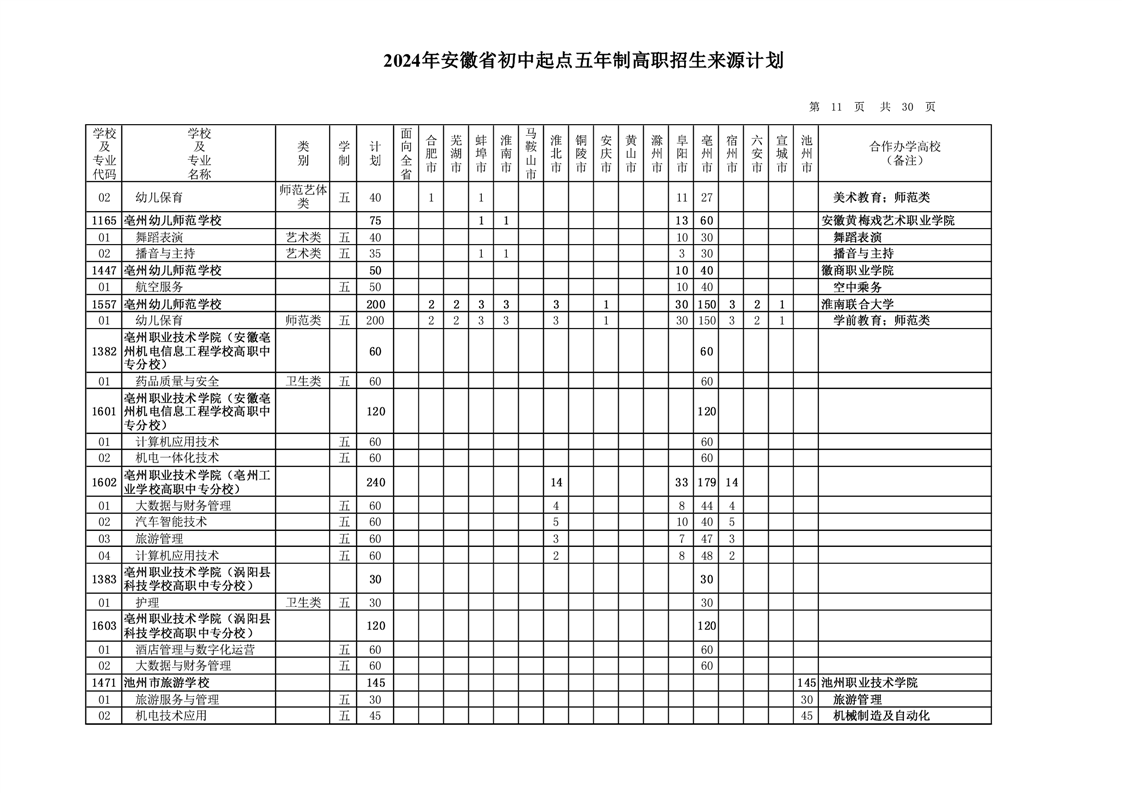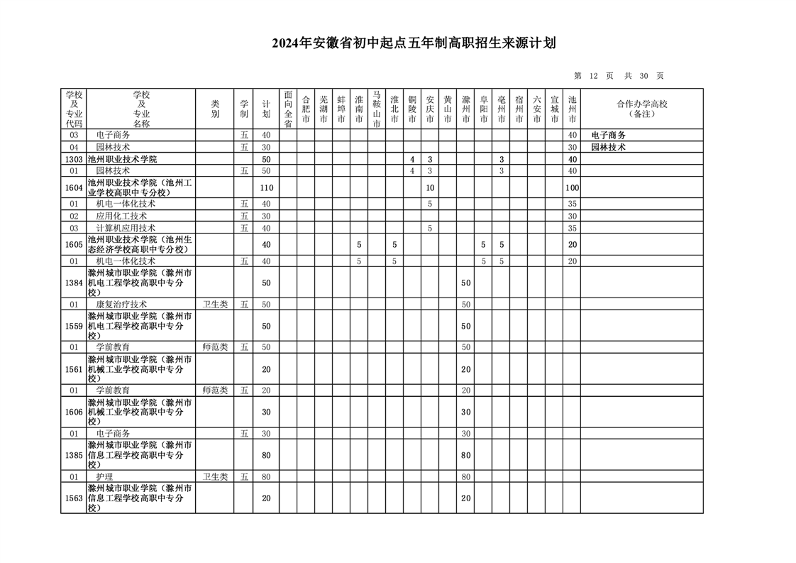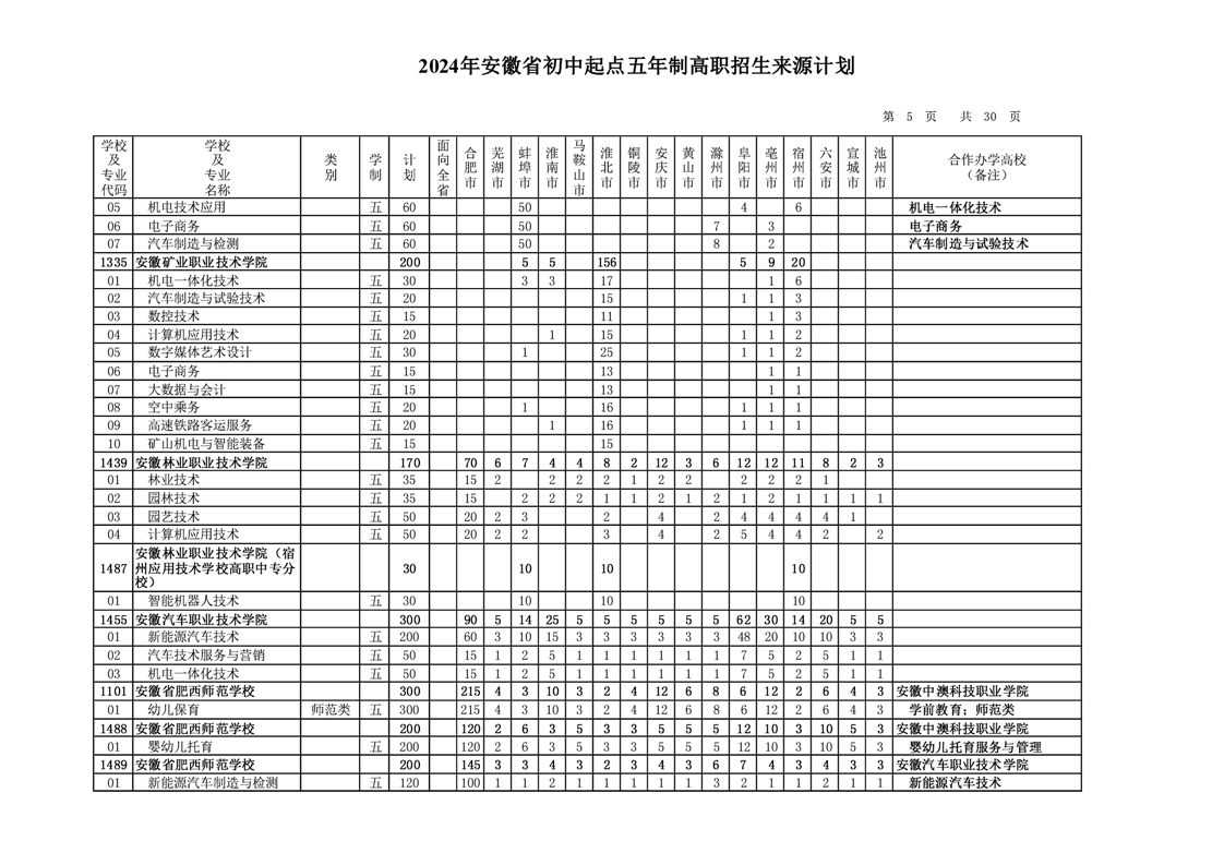 安徽省教育招生考试院关于印发2024年安徽省初中起点五年制高职招生来源计划的通知