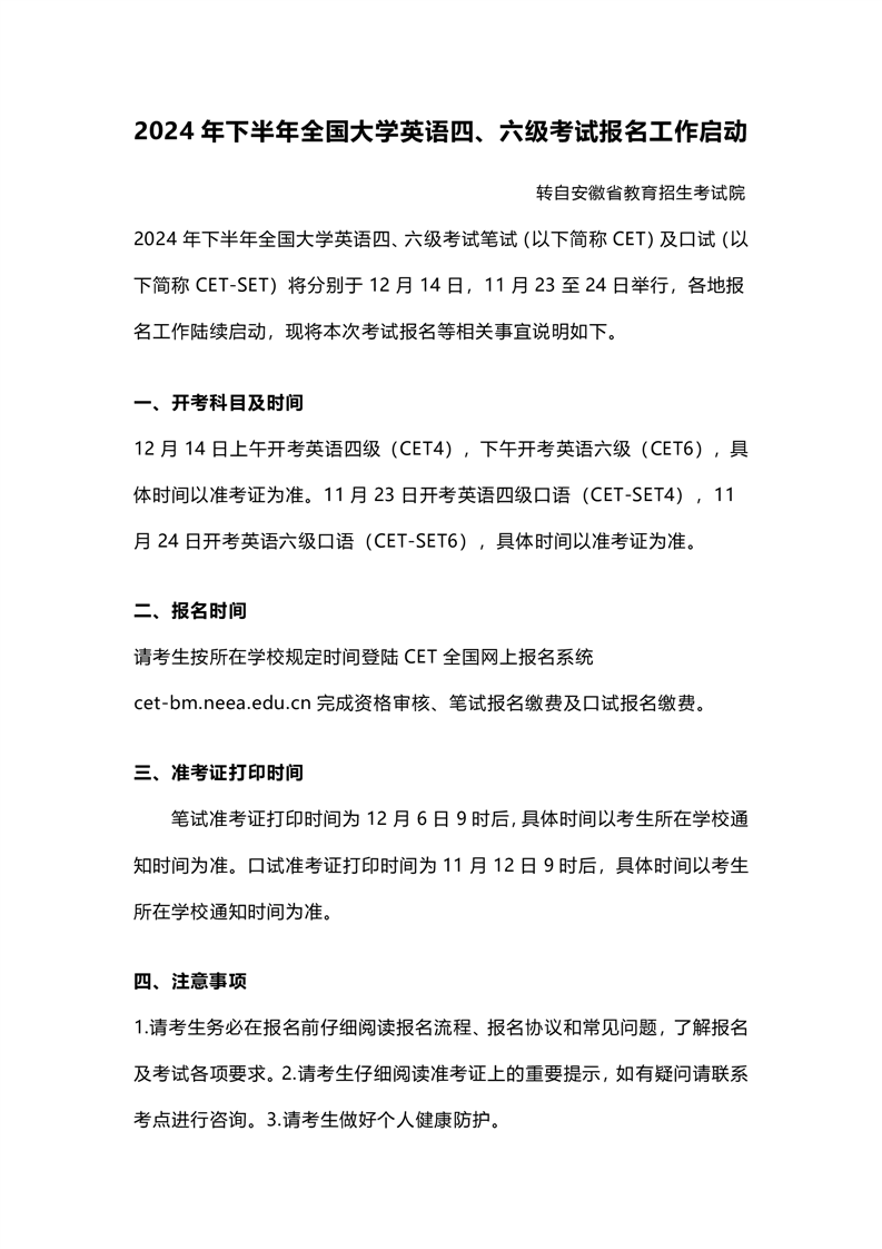024年下半年全国大学英语四🤷🏿、六级考试报名工作启动