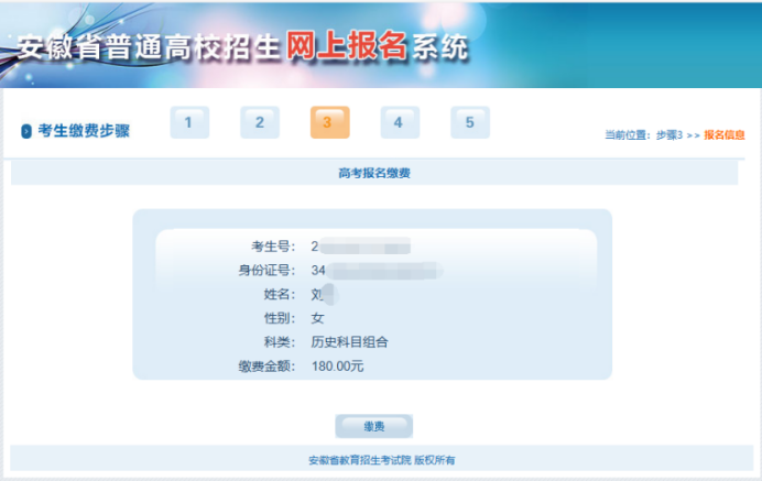 3.仔细核对考生信息并确认无误后😯,点击“缴费”按钮,进行缴费。考生缴费金额由系统自动根据考生是否参加分类、对口考试等条件自动计算,不同考生缴费金额可能不同。
