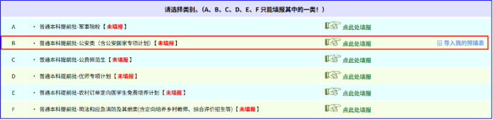 小王同学填报的院校专业组属于“普通本科提前批-公安类(含公安国家专项计划)”,因为已经在志愿填报辅助系统中预填了志愿,可以直接点击对应项后的“导入我的预填表”🌛: