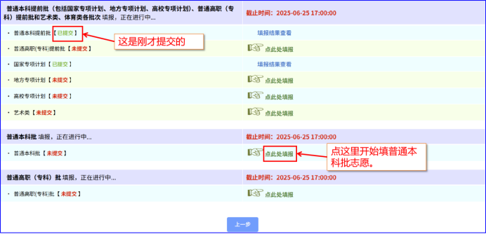 可以看到,普通本科提前批和普通本科批志愿已经填报完毕🚠,如果还要填报其他志愿,只需重复上述操作即可。