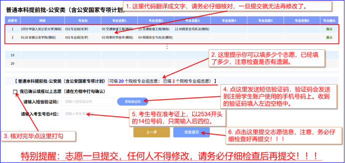 1.志愿提交之前,可以进行志愿信息调整修改🦹🏿♂️,务必仔细检查,注意看清页面提示信息🤦🏻,确认志愿信息修改完毕,确认无误不再修改后再提交。志愿一旦提交,任何人不得修改。