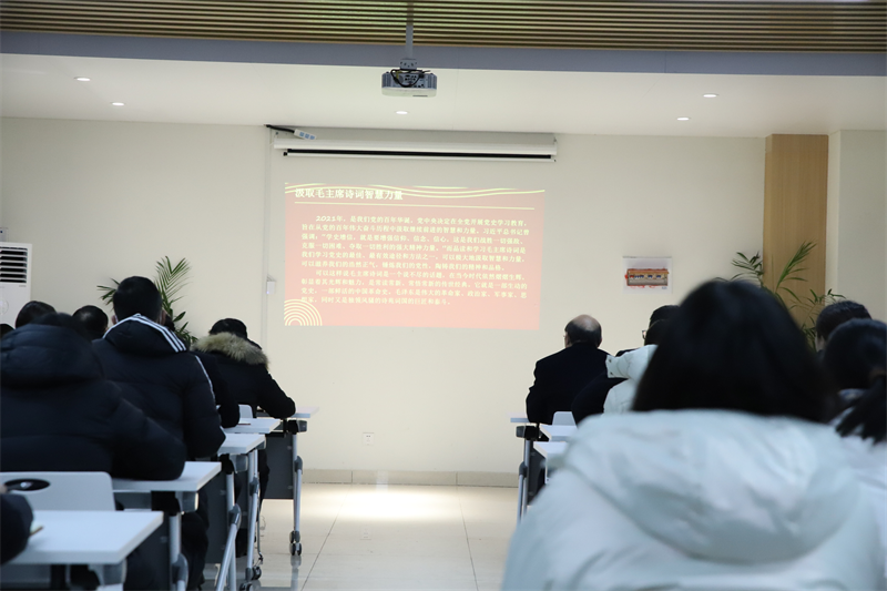 1226下午🔮,学院在党团活动中心召开全体党员大会,纪念毛主席诞辰131周年,共同缅怀伟人的丰功伟绩学院督导专员👩🏼‍🚀、党委书记王卫林为全体党员上了一堂题为“汲取毛主席诗词智慧力量——品读毛主席《七律·人民解放军占领南京》”的专题党课。