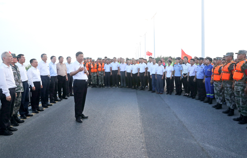 8月18日至21日,中共中央总书记、国家主席、中央军委主席习近平在安徽省考察。这是19日下午,习近平在合肥市肥东县十八联圩生态湿地蓄洪区巢湖大堤上,亲切看望慰问在防汛抗洪救灾斗争中牺牲同志的家属。新华社记者王晔摄