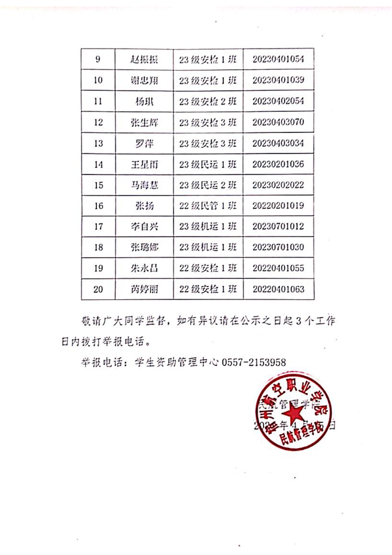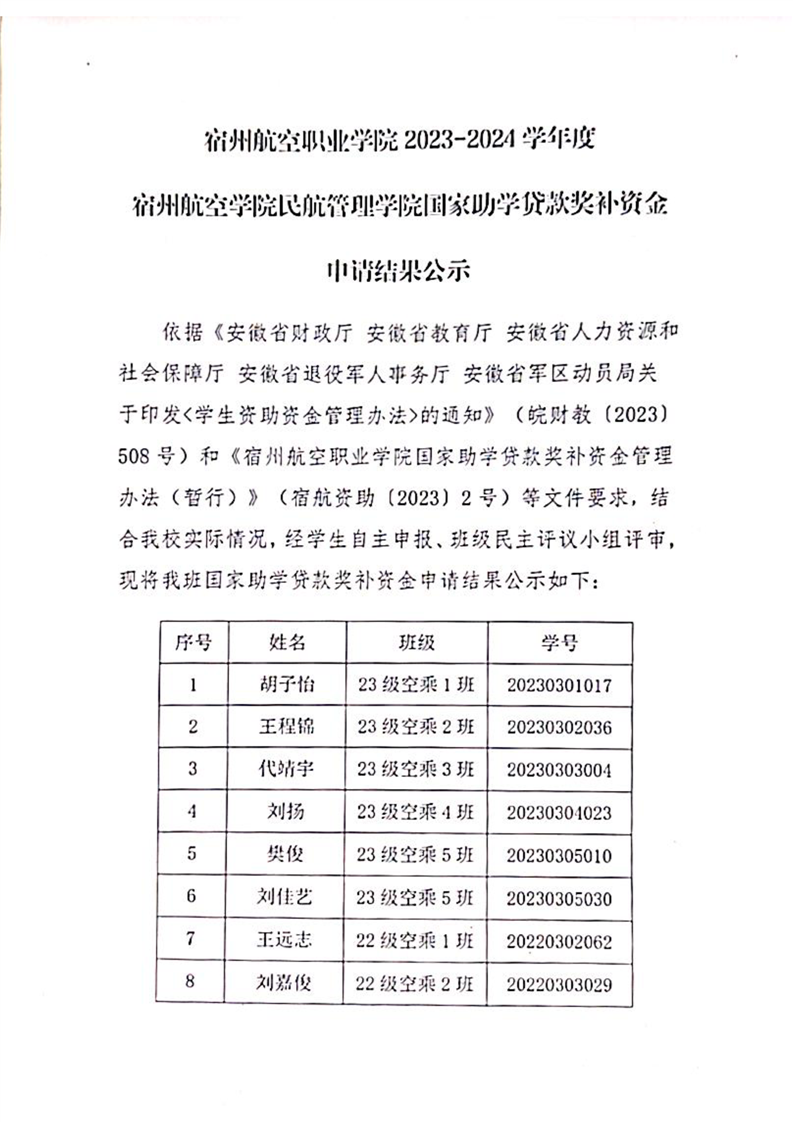 民航管理学院2023-2024学年度国家助学贷款奖补资金申请结果公示