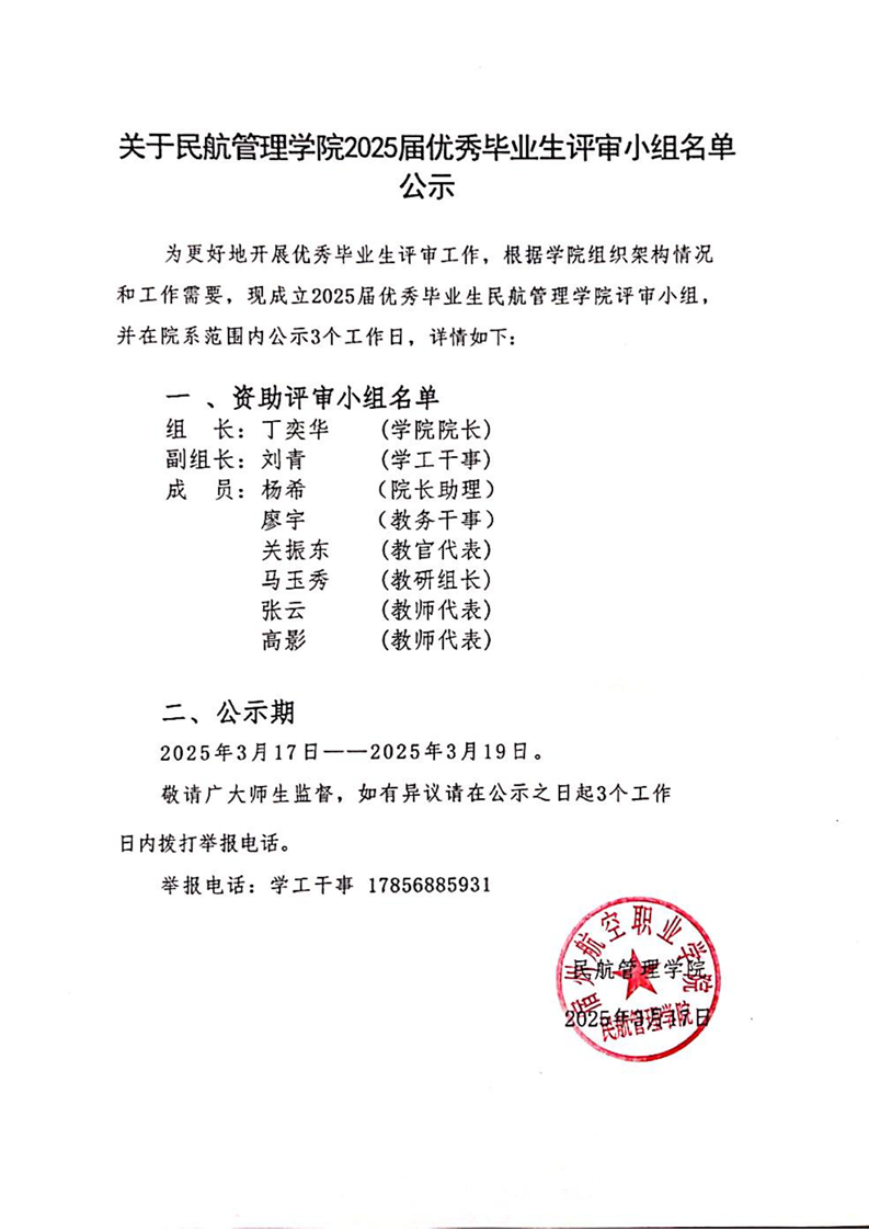 关于民航管理学院2025届优秀毕业生评审小组名单公示