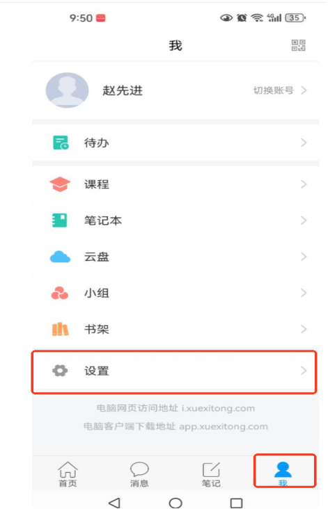 1、登陆学习通,选择“我”,点击“设置”