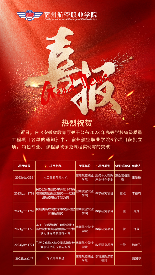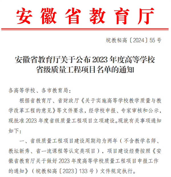 日前🪛🤦‍♀️,安徽省教育厅公布了2023年高等学校省级质量工程项目立项名单,我院6个项目获批立项建设🍅🪥,其中服务十大新兴产业特色专业高端装备制造1项,教学研究项目重点项目1项、一般项目3项,课程思政示范课程1项✌🏽。