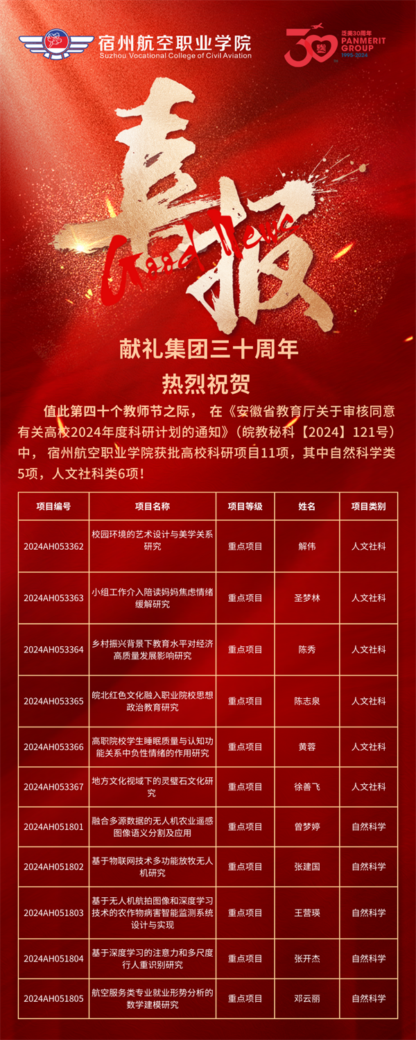 喜报!宿航11个科研项目获批安徽省2024年高校科研重点项目!